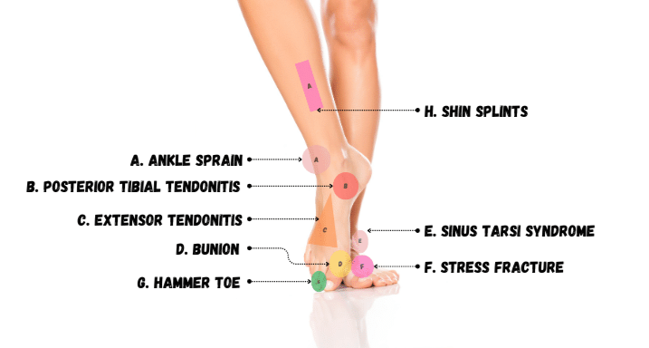 Although shin splints do not typically cause pain on the top of the foot, we are adding them to this list because they can cause pain in the lower leg. Shin splints, technically known as medial tibial stress syndrome, is a condition characterised by pain along the inner edge of the shinbone (tibia). It commonly affects runners, dancers, military recruits, and other people engaged in high-impact activities. The condition arises from excessive stress on the shinbone and the connective tissues that attach muscles to the bone.